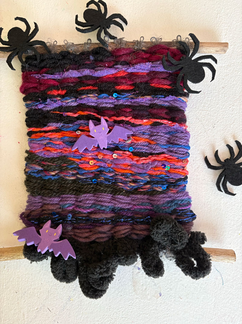On a little frame loom made with twigs and loopy wool, make a Halloween weaving with purples and blacks, blues and silver, spiders and bats, chocolates and sweeties too!